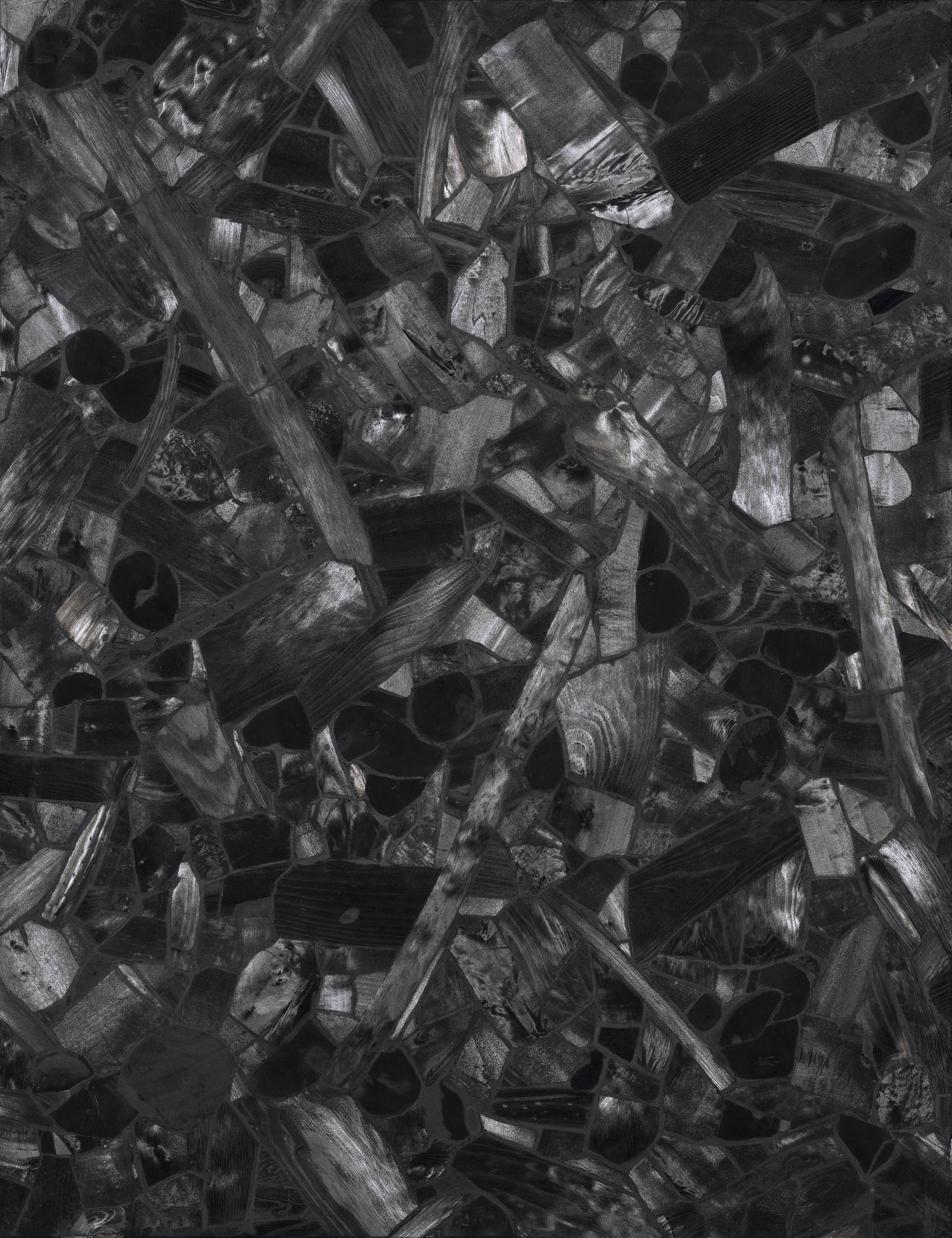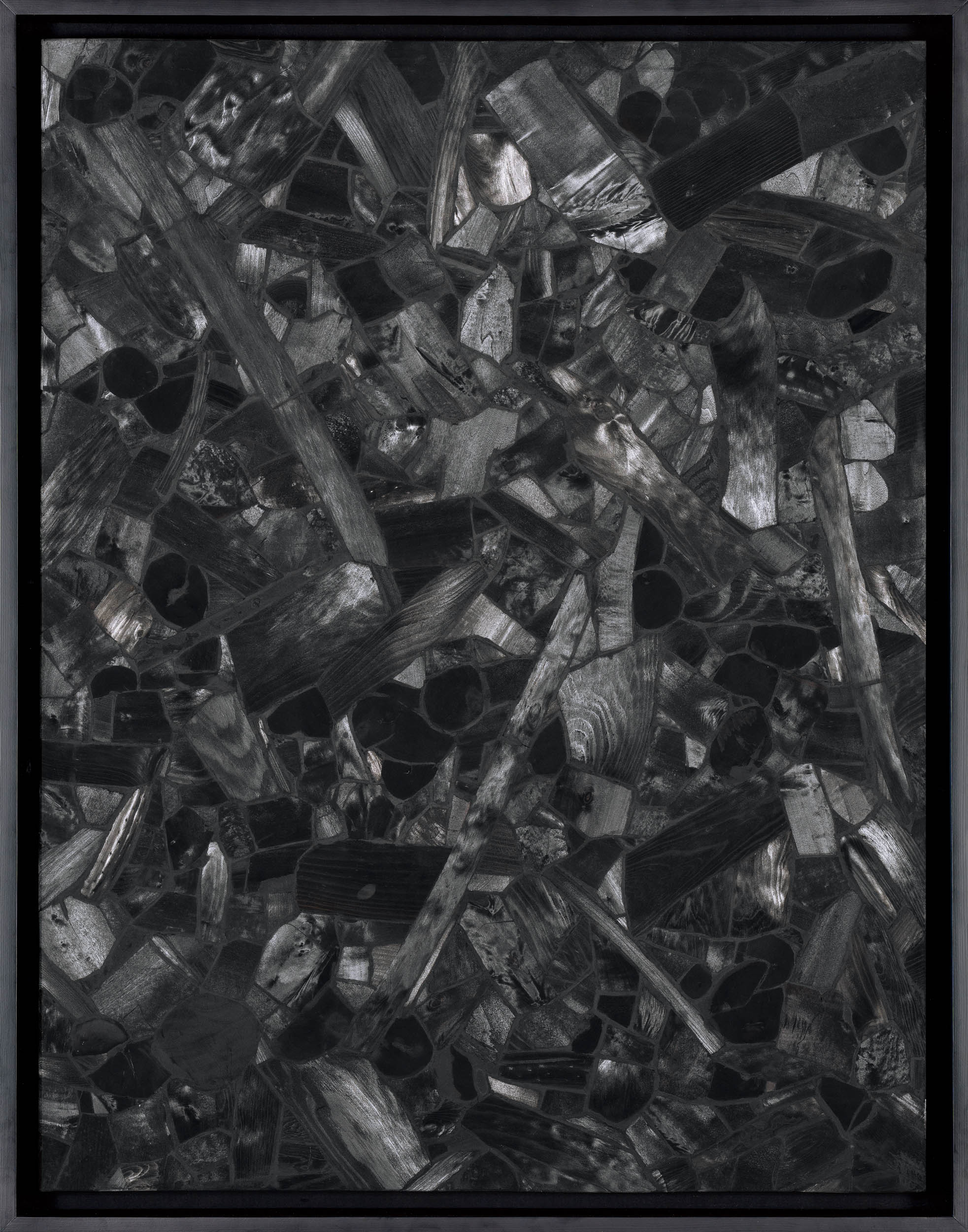 본 출품작 〈불로부터〉(2000)는 숯의 실재감과 조형적 질서가 완벽한 조화를 이루는 수작이다. 작가는 톱으로 정교하게 잘라낸 숯 조각들을 캔버스 위에 빈틈없이 구축한 뒤, 아라비아 고무를 채워 넣고 사포로 연마하는 수행적 과정을 거친다. 그 후 다시 얇은 종이로 표면을 깎아내어 완성된 화면은 숯 특유의 깊은 흑색과 고온에서 구워진 결이 만들어내는 은은한 광택을 동시에 발산한다. 각기 다른 질감을 지닌 숯의 단면들이 중앙을 향해 집결하며 형성한 검은 물결무늬는 거대한 나테의 형상으로 수렴하며, 보는 각도에 따라 무한한 빛의 변주를 선사한다.