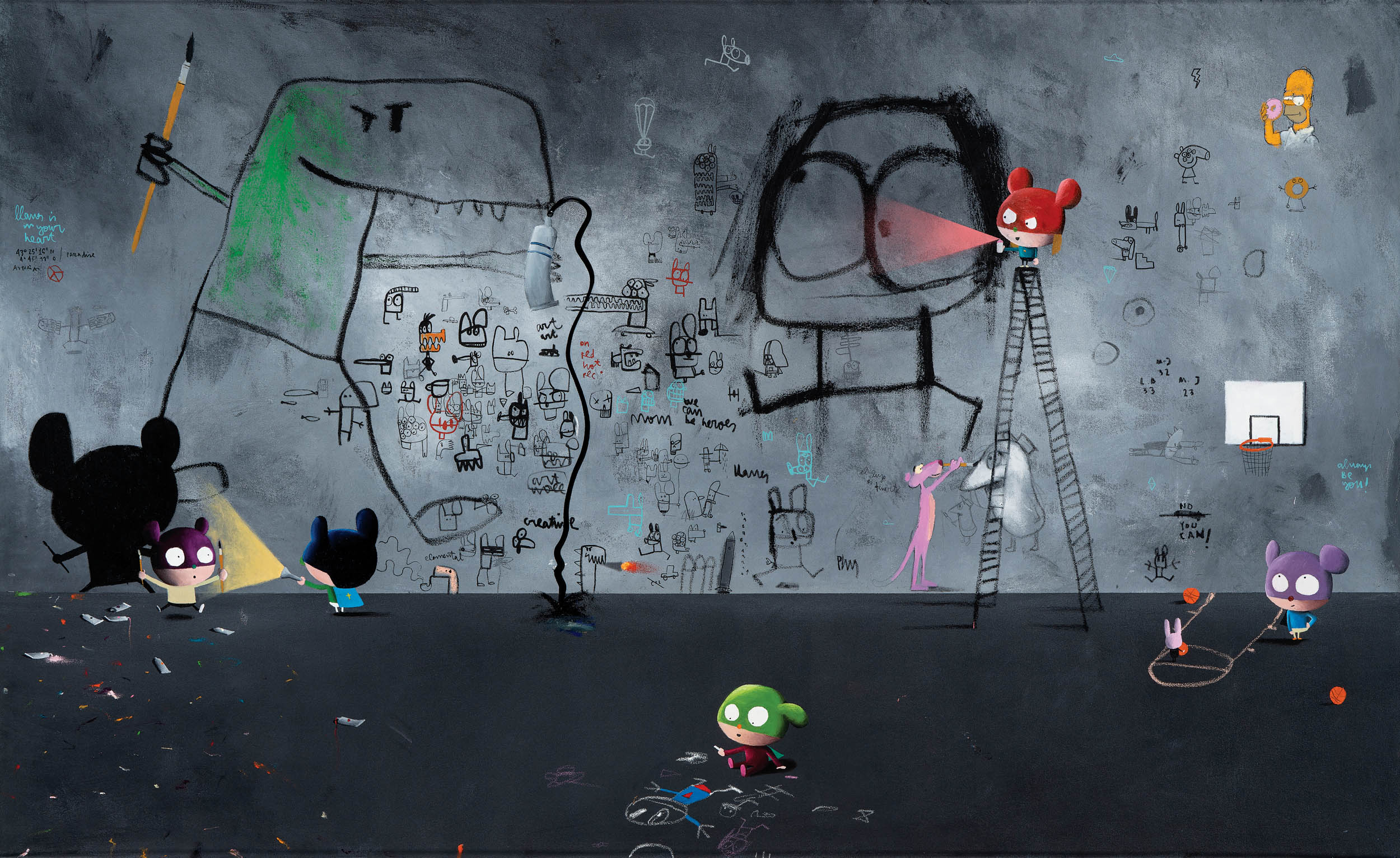 그의 화면에는 만화적 캐릭터와 스트리트적 제스처가 충돌하듯 공존한다. 과장된 눈과 둥근 얼굴의 인물들은 아이 혹은 슈퍼히어로를 연상시키며, 특히 검은 윤곽선으로 강조된 커다란 눈은 강렬한 시각적 집중점을 형성한다. 블랙 라인을 기반으로 한 고채도의 원색 대비는 화면의 에너지를 극대화하고, 배경에는 낙서를 연상시키는 텍스트와 기호, 얼룩이 중첩되어 즉흥성과 긴장감을 더한다.